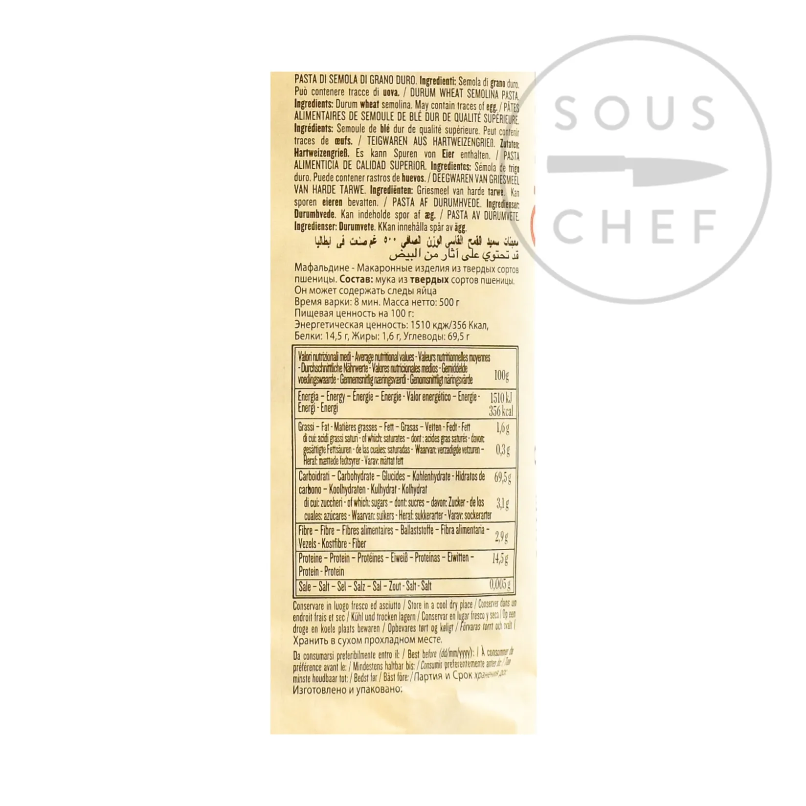 Rummo mafaldine pasta no. 80 is long wide strips of pasta with a frilly edge. Try the mafaldine pasta with a slow-braised rich ragu, or with pan-fried wild mushrooms and cream. Rummo mafaldine pasta cooks in 8 minutes. Before cooking the mafaldine pasta is 26cm long and 1.4cm wide.