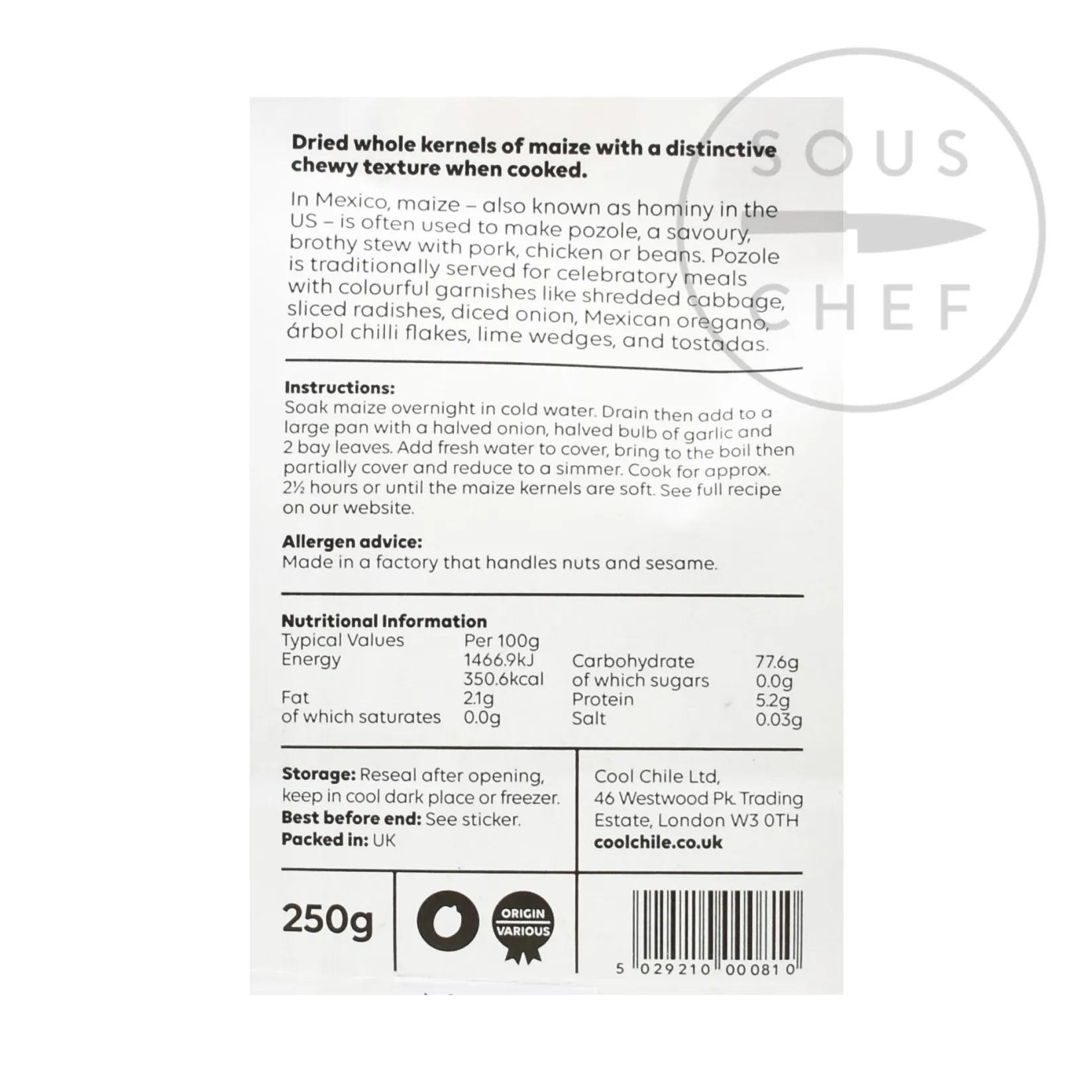 To prepare your maize for pozole, soak the kernels overnight in cold water.Drain then add to a large pan with a halved onion, halved bulb of garlic and 2 bay leaves. Add fresh water to cover, bring to the boil then partially cover and reduce to a simmer. Cook for approx. 2½ hours or until the maize kernels are soft.