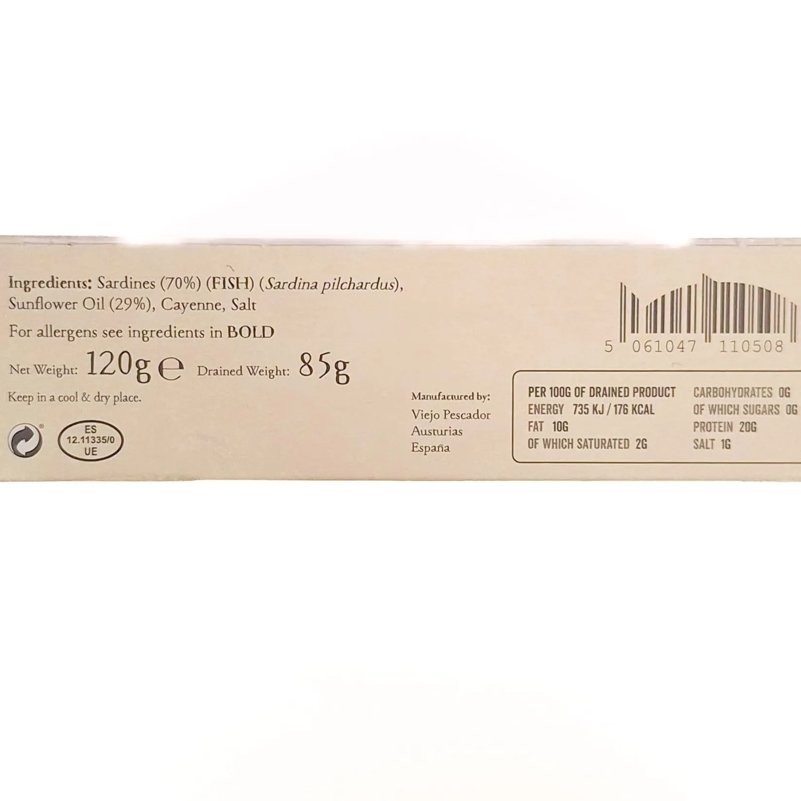 Product formulations and details may change. For the latest ingredients and allergen information always check product packaging prior to consumption. Ingredients: Sardines, sunflower oil, cayenne, salt