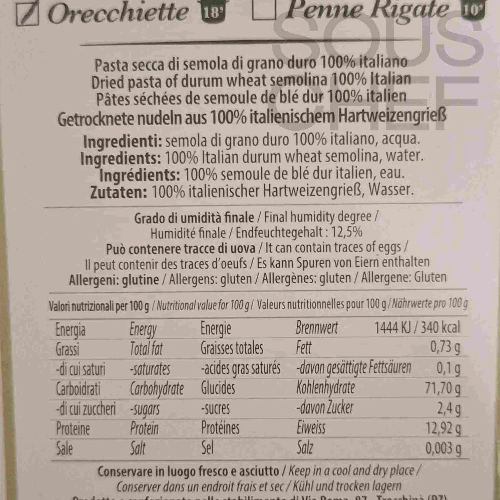 Product formulations and details may change. For the latest ingredients and allergen information always check product packaging prior to consumption. Ingredients: Orecchiette: 100% Italian durum wheat semolina, water; cime: turnip greens 64%, extra virgin olive oil 34%, salt, aromatic herbs in variable proportion: dry garlic, dried oregano, dried basil, spicy chili powder, dried rosemary. citric acid; chilli oil: extra virgin olive oil 99%, chilli 1%