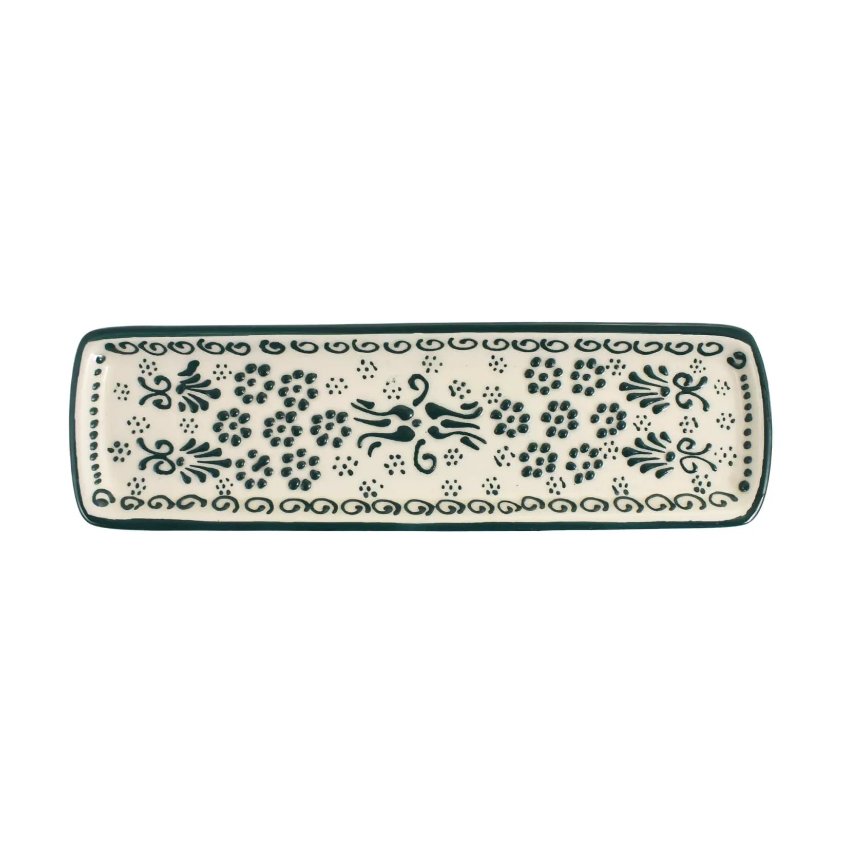 Use this Turkish green patterned tray to serve baklava, canapés and sushi. The long, slim shape is perfect for small bites and slices of fresh bread.