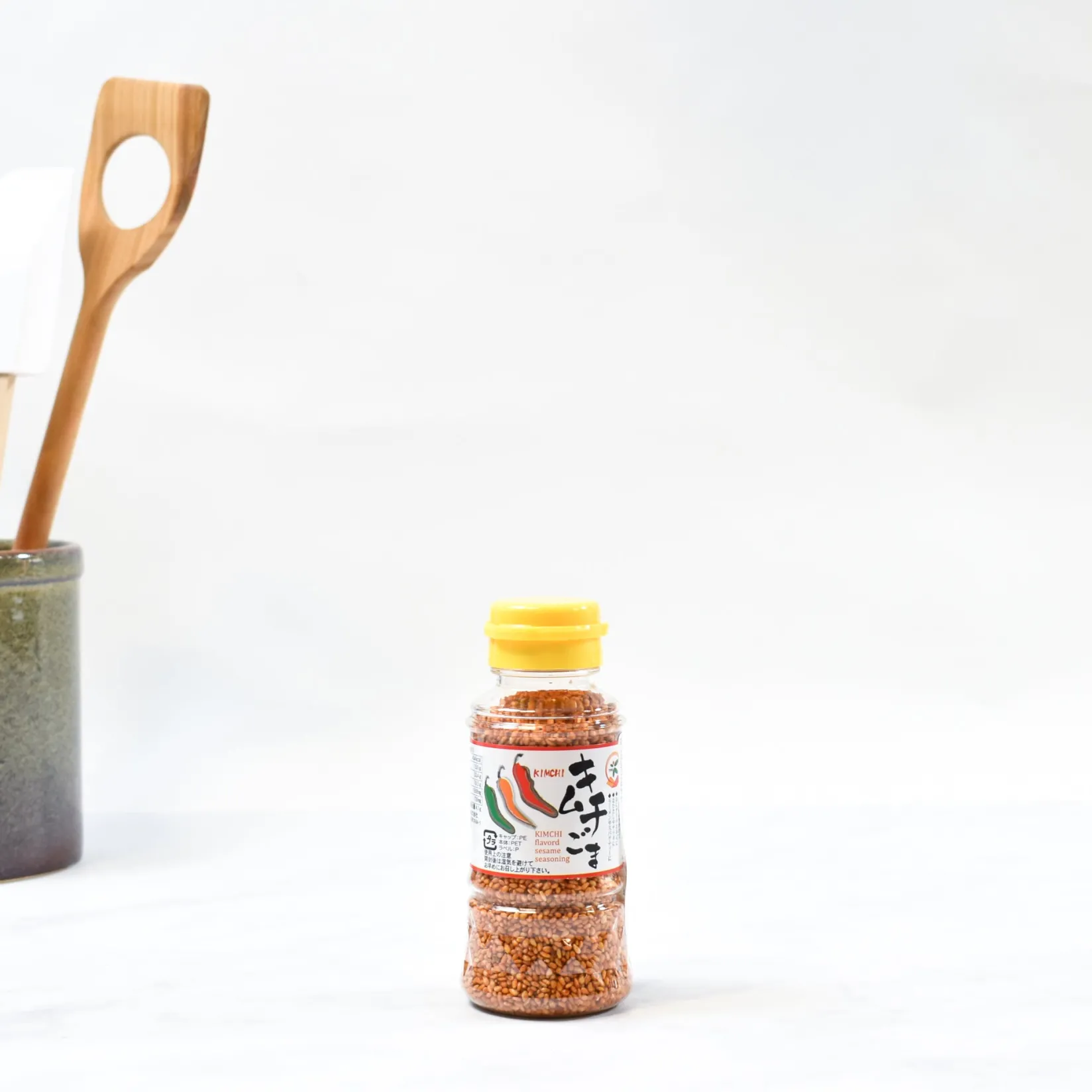 Scatter kimchi roasted sesame seeds over rice or noodles to add crunch, nuttiness and the signature fiery heat of kimchi. The sesame seeds are roasted with red chilli pepper flakes, garlic and bonito extract. Try using the seeds to add heat to the outside of a California sushi roll, or use in a crispy coating for fried prawns. The orange-hued kimchi roasted sesame seeds are also handy for decorating food in bento boxes.