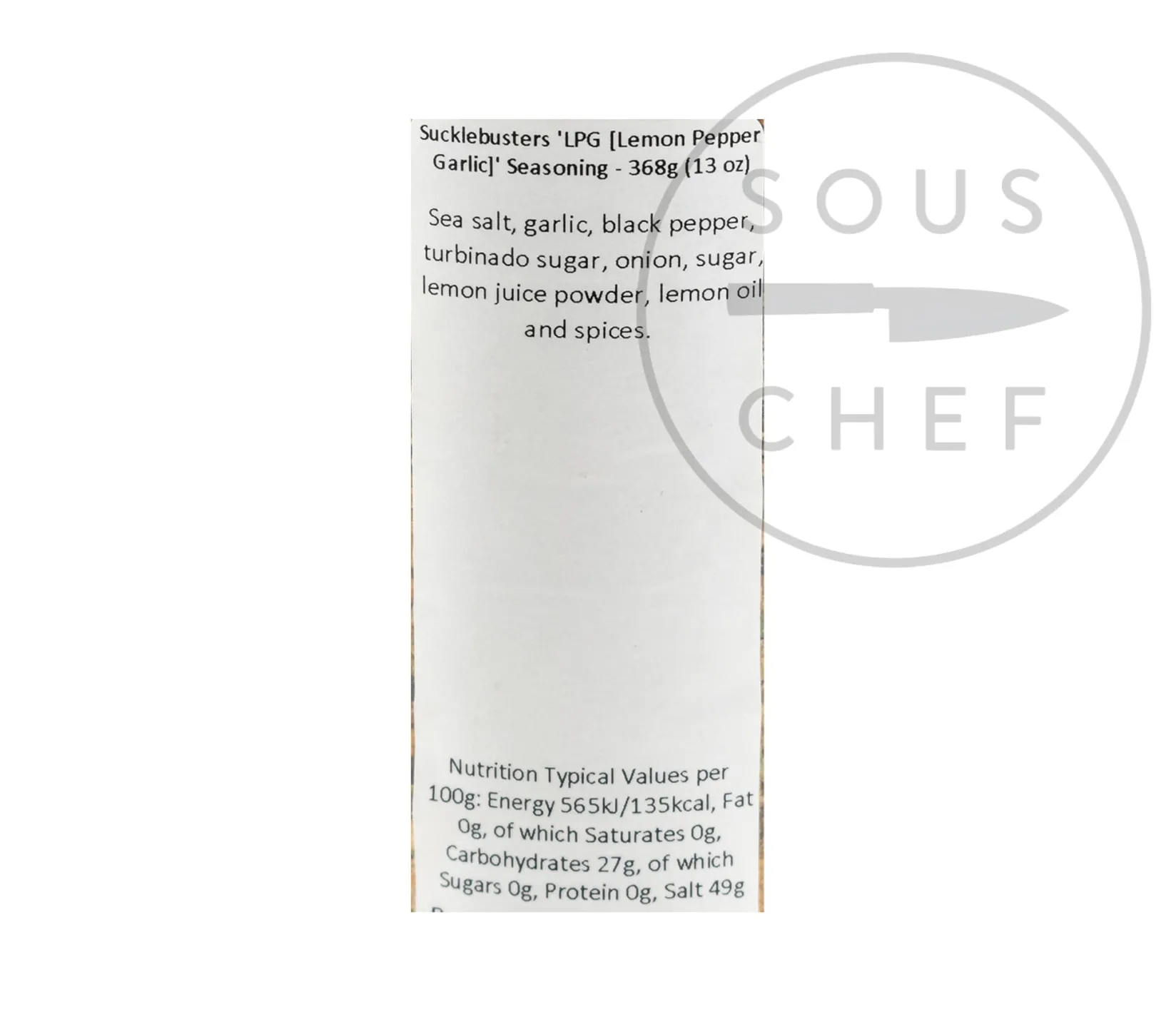 Product formulations and details may change. For the latest ingredients and allergen information always check product packaging prior to consumption. Ingredients: Sea salt, garlic, black pepper, turbinado sugar, onion, sugar, lemon juice powder, lemon oil and spices.