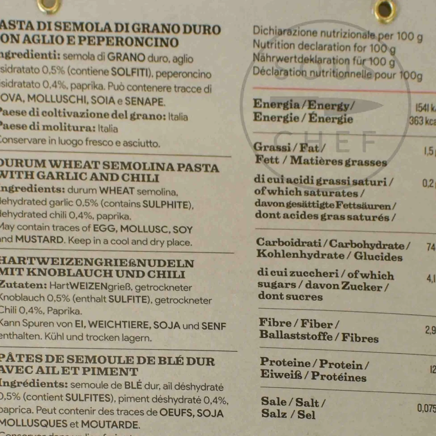 Product formulations and details may change. For the latest ingredients and allergen information always check product packaging prior to consumption. Ingredients: durum WHEAT semolina, dehydrated garlic 0,5% (contains SULPHITE), dehydrated chili 0,4%, paprika.