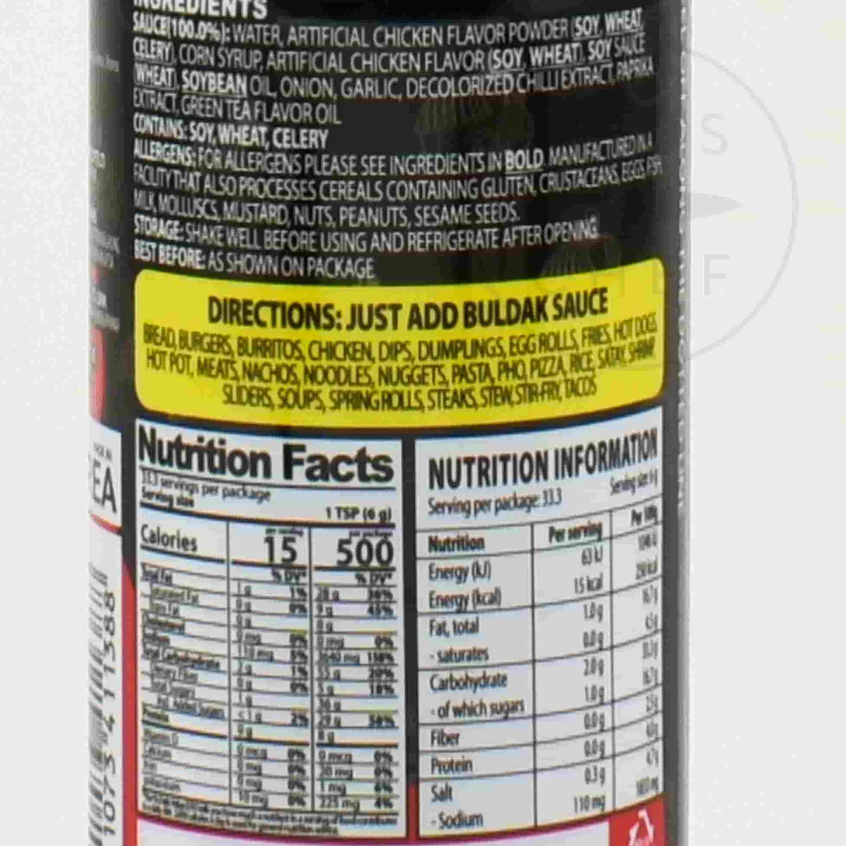 Product formulations and details may change. For the latest ingredients and allergen information always check product packaging prior to consumption. Ingredients: water, artificial chicken flavour powder (soy, wheat, celery), corn syrup, artificial chicken flavour (soy,wheat, soy sauce (wheat), soybean oil, onion, garlic, decolourised chilli extract, paprika extract, green tea flavour oil).