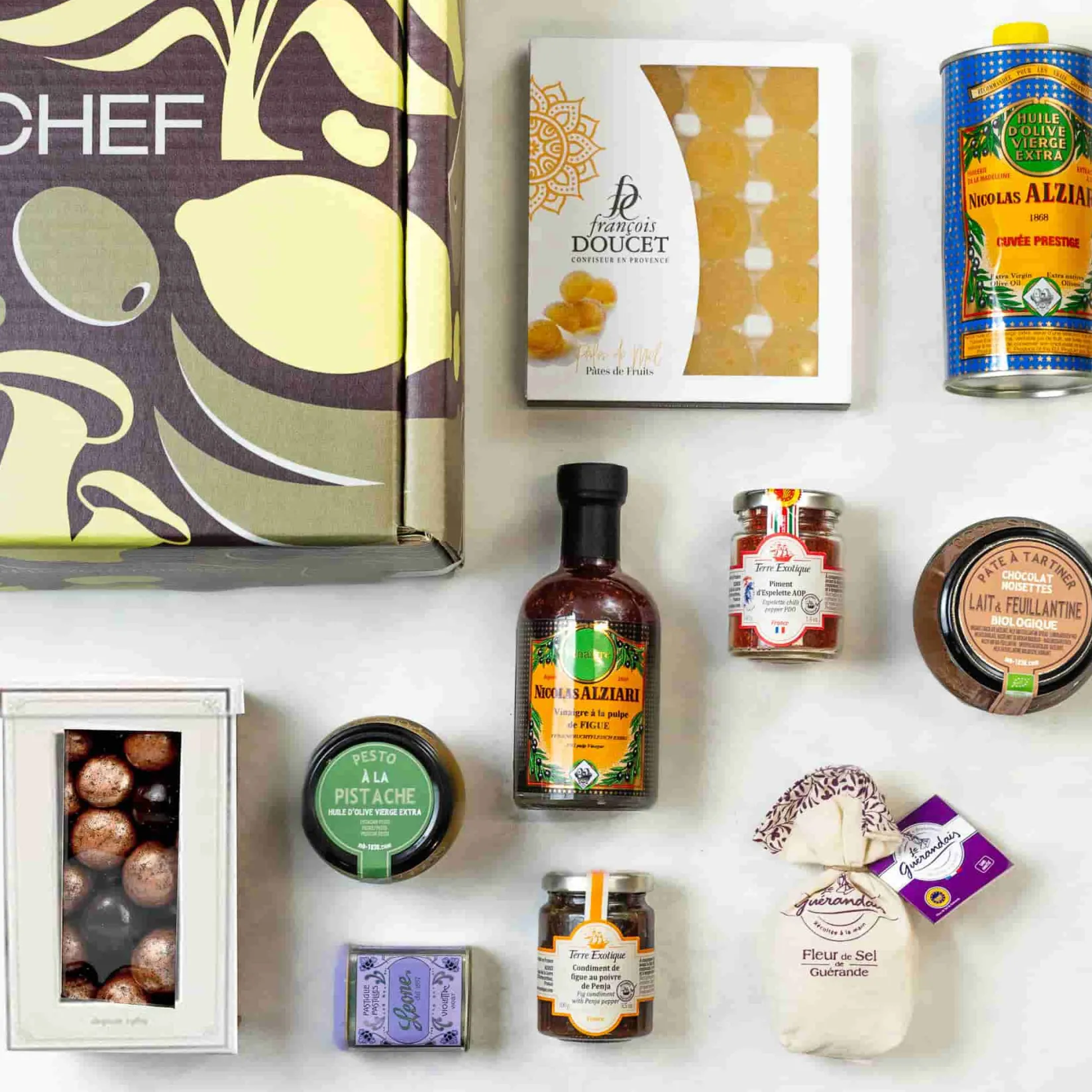Francois Doucet’s fragrant, sweet jellies are intensely fruity, perfect mid-morning or as an after-dinner snack. Complete your cheeseboard with Terre Exotique’s sweet and peppery fig chutney. The nutty fragrance of Maison Bremond’s pistachio pesto is delicious on croutons for an effortlessly delicious canape. Plus, upgrade your kitchen staples with the finest ingredients, from Alziari’s rich olive oil to a pure sprinkle of Fleur de Sel.