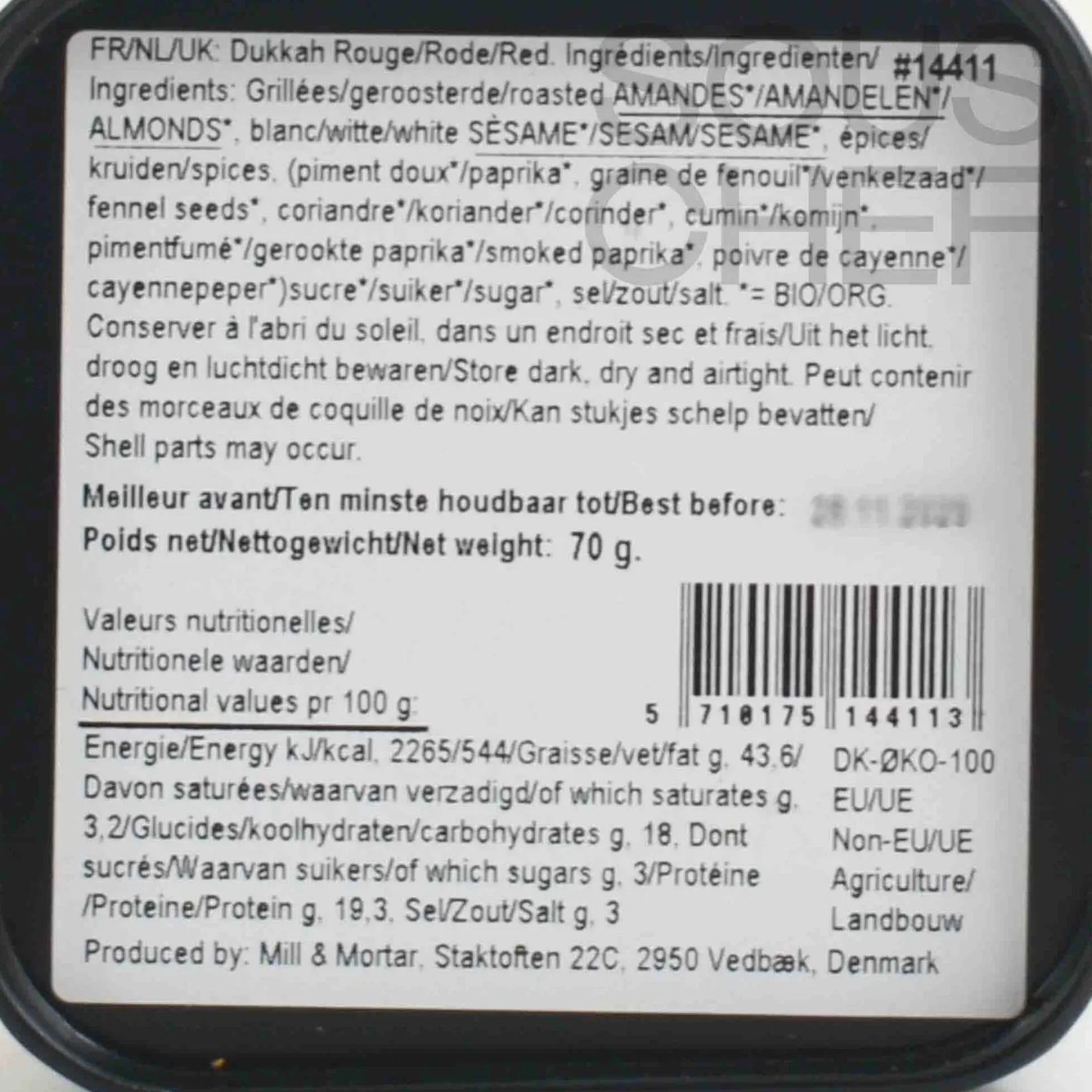 Organic red dukkah is a herby, nutty Middle Eastern condiment. It’s typically served with warm flatbreads and extra virgin olive oil. Dip the bread in the oil, scatter the dukkah on top and enjoy!