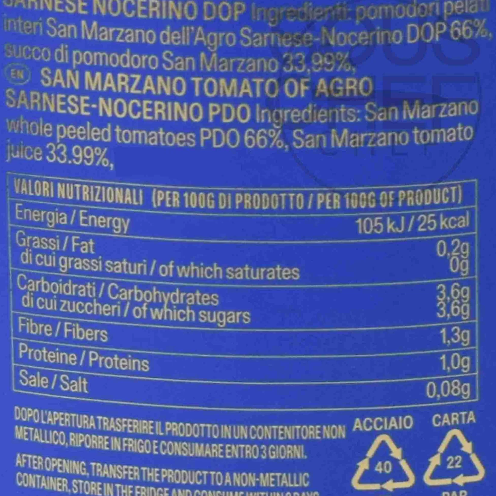 Product formulations and details may change. For the latest ingredients and allergen information always check product packaging prior to consumption. Ingredients: San Marzano whole peeled tomatoes PDO 66%, San Marzano tomato juice 33.99%