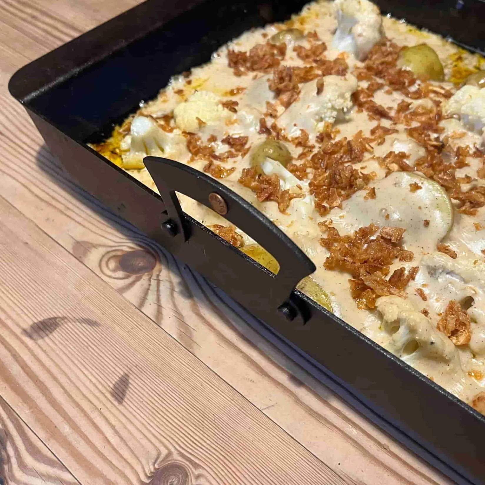 Made from durable spun iron, the tray is also ideal for baking. It’s pre-seasoned with organic flax oil and develops a non-stick patina over time. You can use it on the hob, in the oven and on the barbecue. It’s designed to fit directly onto the runners of AGA ovens.