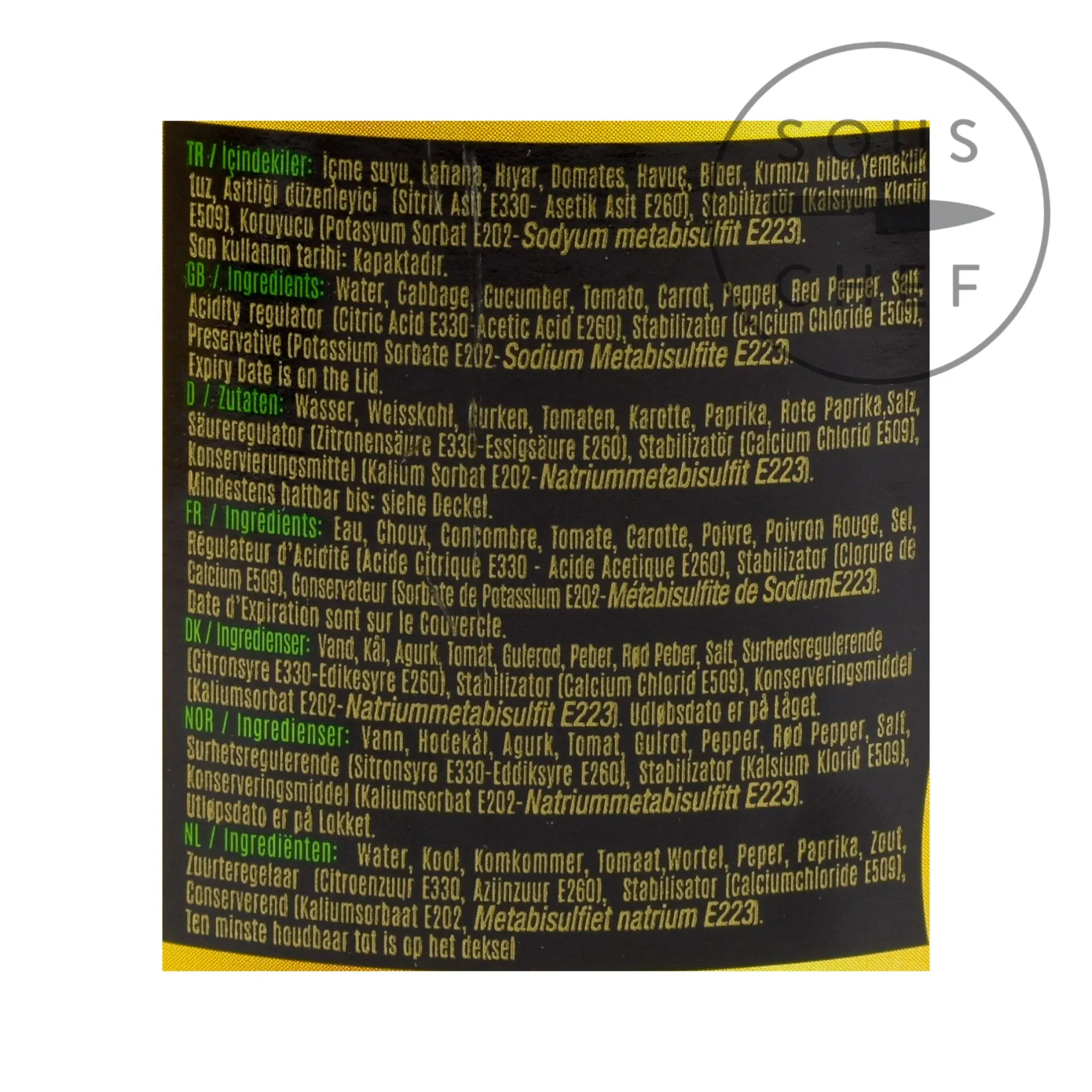 Product formulations and details may change. For the latest ingredients and allergen information always check product packaging prior to consumption. Ingredients: Water, cabbage, cucumber, tomato, carrot, pepper, red pepper, salt, acidity regulator (citric acid E330, acetic acid E260), stabilizer (calcium chloride E509), preservative (potassium sorbate E202, sodium metabisulfite E223).