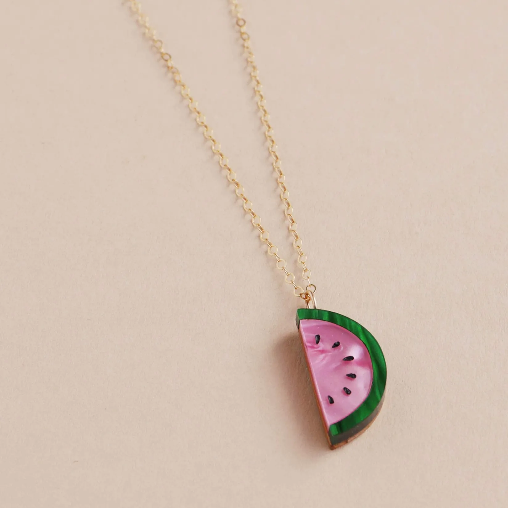This handcrafted watermelon necklace will add a touch of tropical glamour to any outfit. Designed to look like a juicy wedge of watermelon, the pendant is made from lightweight acrylic with beautiful hand-inked details. Hung from a gold-filled cable chain, this fruity necklace is perfect for parties, picnics and cocktail hour!