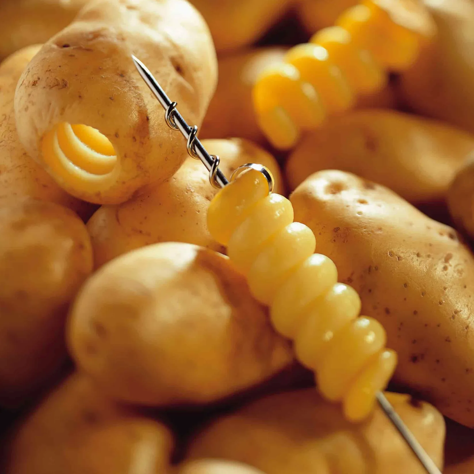 Position the tip of the curler over the centre of the vegetable. Use the handle to twist through to create a spiral. It can be used on all kinds of foods, such as carrots, courgettes and potatoes.