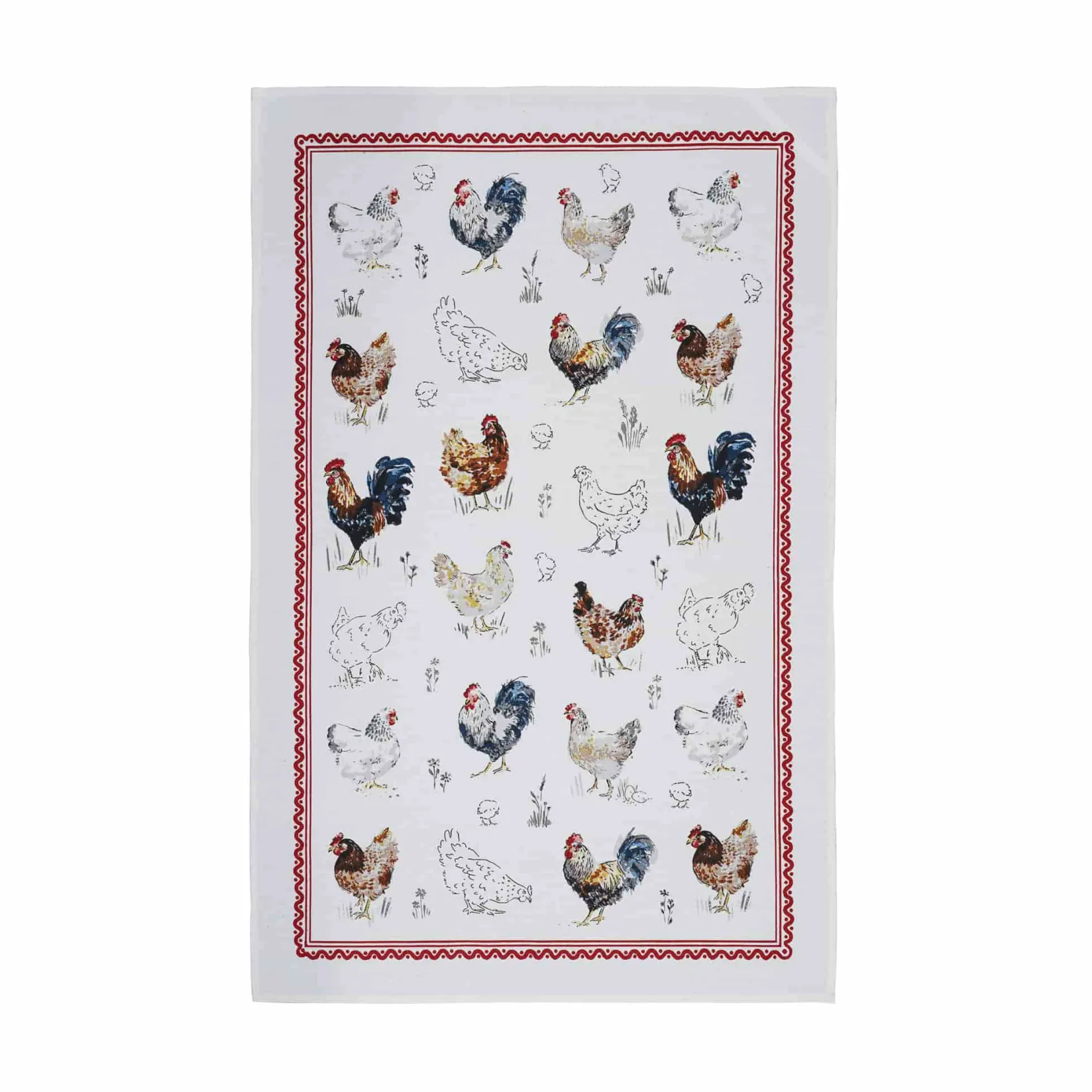 This cotton tea towel brings farmhouse chic to your kitchen. Inside the bright red border is a flock of plump hens and strutting roosters. Look closely to discover fluffy chicks between the larger birds.