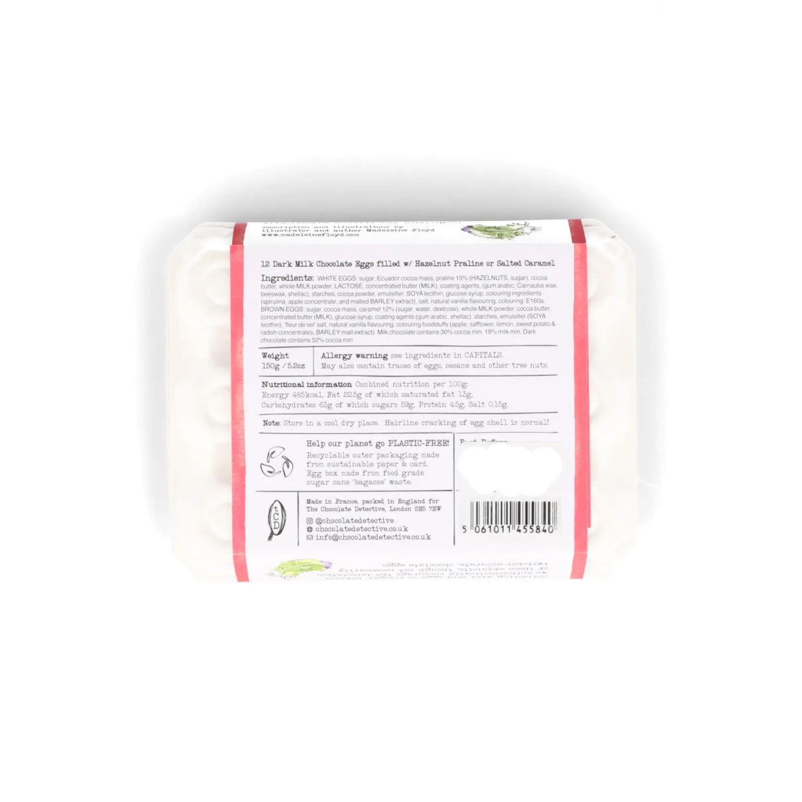Product formulations and details may change. For the latest ingredients and allergen information always check product packaging prior to consumption. Ingredients: white or green eggs: sugar, ecuador cocoa mass, praline 15% (hazelnuts, sugar), cocoa butter, whole milk powder, lactose, concentrated butter (milk), coating agents, (gum arabic, carnauba wax, beeswax, shellac), starches, cocoa powder, emulsifier: soya lecithin, glucose syrup, colouring ingredients (spirulina, apple and safflower concentrate, and malted barley extract), salt, natural vanilla flavouring, colouring: e160a. brown or blue eggs: sugar, ecuador cocoa mass, caramel 12% (sugar, water, dextrose), whole milk powder, cocoa butter, concentrated butter (milk), glucose syrup, coating agents (gum arabic, carnauba wax, beeswax, shellac), starches, emulsifier: soya lecithin, colouring foodstuffs (spirulina, apple, safflower, lemon, sweet potato and radish concentrates, malted barley extract), “fleur de sel” salt, natural vanilla flavouring. milk chocolate contains 30% cocoa min, 19% milk min. dark chocolate contains 52% cocoa.