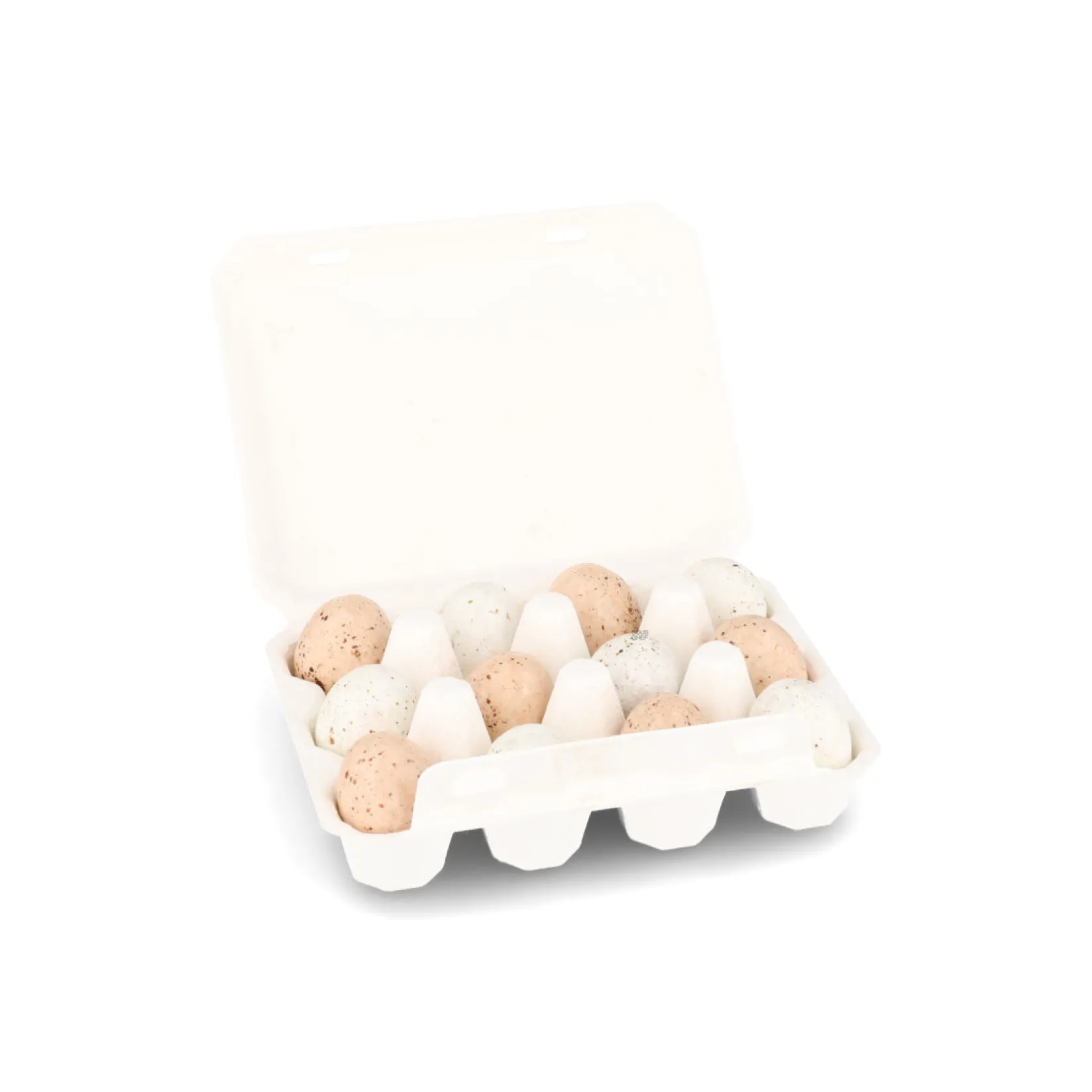 Six eggs are filled with smooth salted caramel. The rest are filled with a rich hazelnut praline.