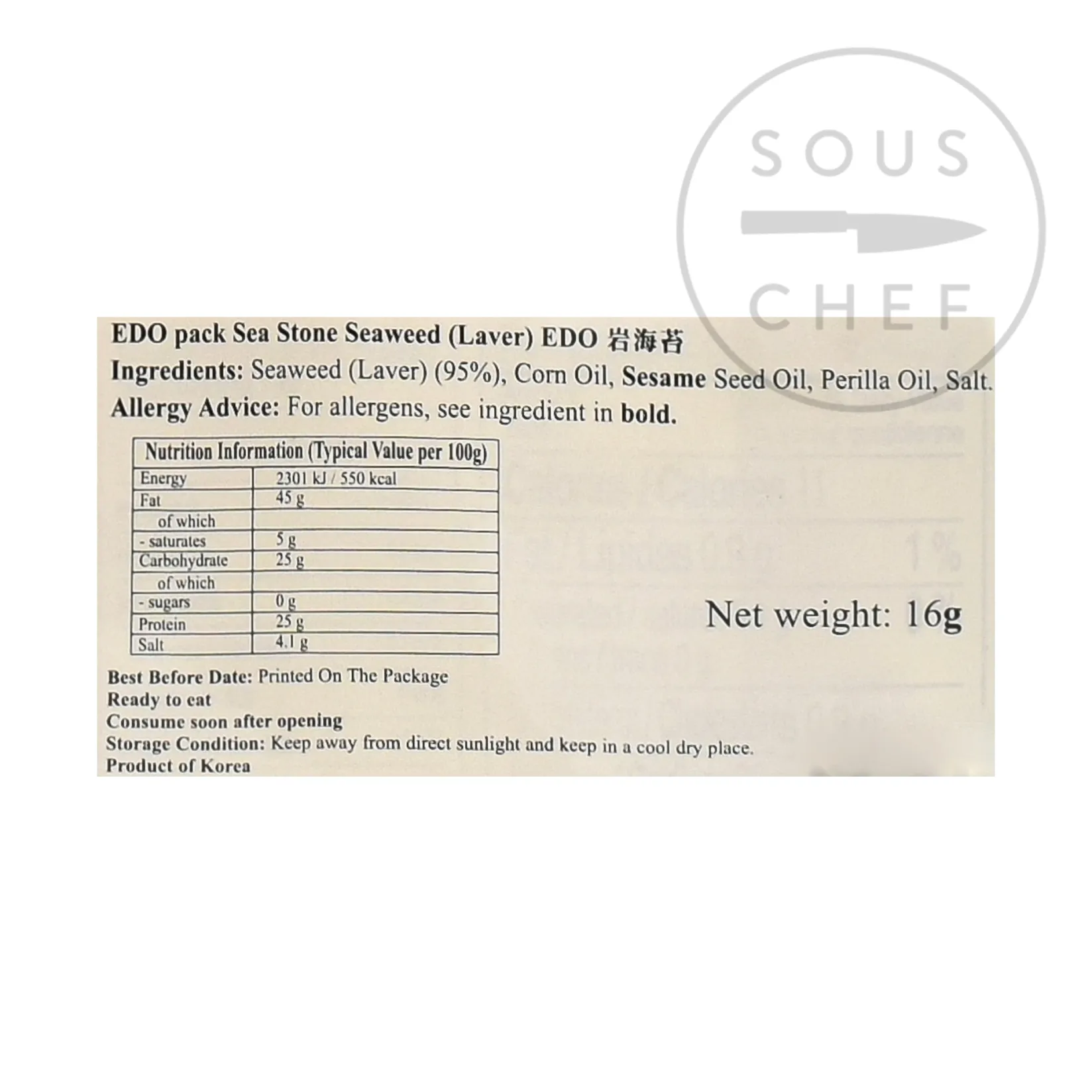 Small sheets of seasoned or flavoured seaweed laver make a tasty and low calorie snack. The seaweed is seasoned with salt and sesame oil making them great to eat straight from the packet. Also shred the sheets finely to garnish noodle dishes and ramen, or use like Japanese nori sheets to wrap around Korean or Japanese onigiri rice balls.