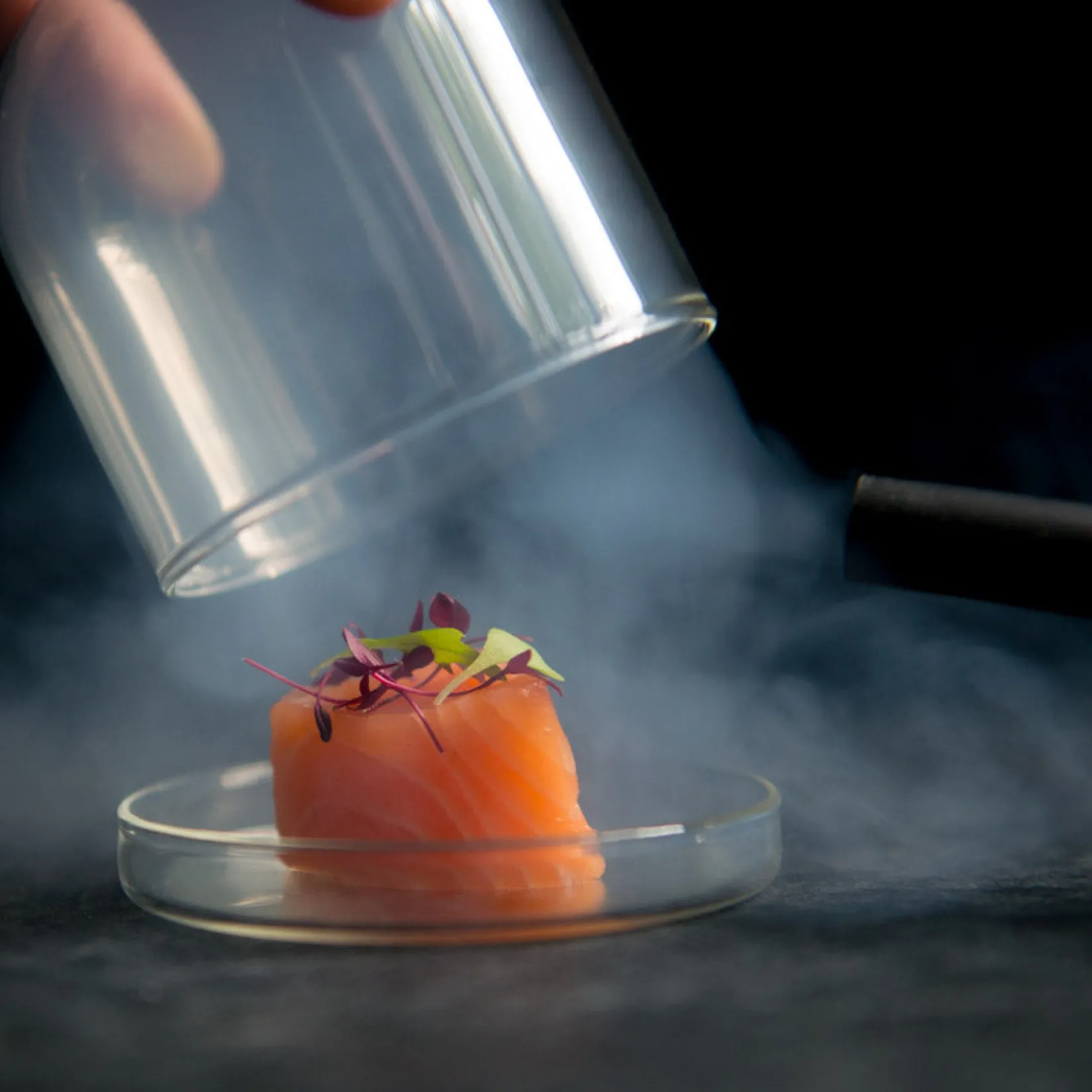 The smoking gun offers a handheld alternative to traditional smoking methods. The cold smoke is easy to direct with the smoking tube, and can be added at any stage of a dish. With the smoking gun, it’s easy to control the intensity of the smoke flavour you’re adding. And for dramatic tableside presentation, fill an upturned glass, cloche or box with smoke, and lift it to reveal the almost magical smoke at the table.